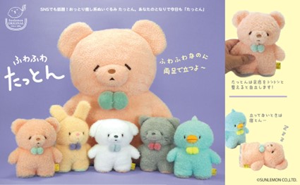 株式会社サンレモンが展開する、足元の重さで自立できるぬいぐるみシリーズ。ちょっとレトロな癒し系のフェイス、ふわふわなのに両足で立つ姿がSNSで話題に。キャラクターとのコラボレーションや、様々な動物、架空の生き物、動物ではないデザインなど斬新なラインナップが常に話題を呼んでいる。