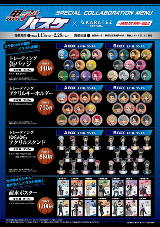 コラボ開催全店では、黒子のバスケに登場する学校をイメージしたコラボドリンクを販売します。また歴代テーマソングの課題曲チャレンジキャンペーンを実施するほか、池袋東口店、秋葉原昭和通り口店、新宿大ガード店では、限定のノベルティが付いたセットメニュー、コラボグッズを販売します。