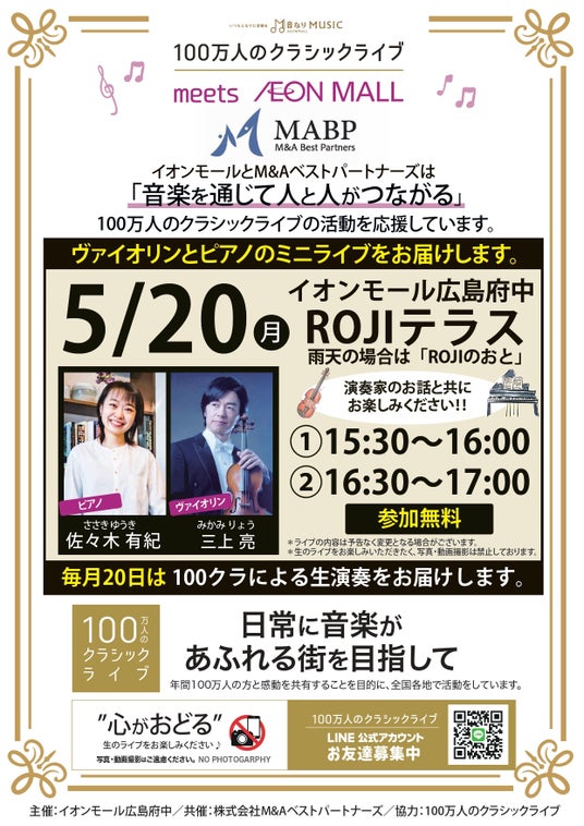 製造、建設、不動産、医療・ヘルスケア、物流、ITに特化したM&A仲介を行う株式会社M&Aベストパートナーズ(本社:東京都千代田区、代表取締役社長:齋藤 達雄 以下M&Aベストパートナーズ)は、イオンモール広島府中にて、クラシックライブ(協力:一般財団法人100万人のクラシックライブ 以下100万人のクラシックライブ)を、5/20(月)に開催することをお知らせいたします。