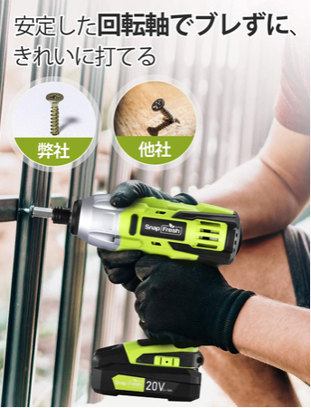 SnapFreshのインパクトドライバーは安定性に優れた回転軸でより高い作業効率を提供いたします。この軽量インパクトドライバーは使い勝手がとてもよいので、日曜大工や家具の組立て、自転車の整備など様々なシーンで大活躍します。
