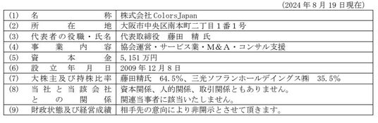 ColorsJapan社との業務提携につきましては、2024年6月17日付「ColorsJapan社との業務提携によるM&A強化に関するお知らせ」のとおり、マーチャント社が、ColorsJapan社と業務提携し、M&Aに取り組み、さらなる企業価値向上をはかるものであります。