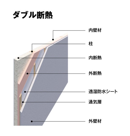 無印良品の家で標準採用しているダブル断熱工法。内断熱だけの場合、柱や梁などの構造材で断熱材が途切れてしまいますが、ダブル断熱では、この部分を外断熱材がすっぽりと包み込み、高い断熱性能が発揮されます。本仕様では外断熱に使用されるフェノールフォームの厚みを従来の1.5倍、内断熱のグラスウールの密度を1.25倍とし、断熱性能を大幅に向上しました。