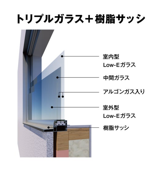 窓は家の中で最も熱の出入りが大きい場所。無印良品の家では、大きな窓を作っても快適に過ごせるよう、断熱性の高いLow-Eトリプルガラスを標準採用しております。本仕様ではサッシに樹脂サッシを採用。トリプルガラスとの組み合わせで熱貫流率は従来の1.5倍に※4。より冷暖房効率を高め、光熱費を削減します。