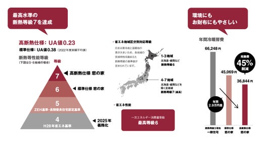 標準仕様の「窓の家」は、既にUA値0.38※2、断熱等級6、また一次エネルギー消費量等級は最高等級6に対応しておりますが、高断熱仕様「窓の家」は、更に断熱性の高い仕様に改良することで、UA値=0.23、断熱等級7※1のモデルを実現することができました。この結果、年間冷暖房費は断熱等級5相当の一般住宅と比較し、約45%削減効果※3が見込まれ、省エネ性の高い仕様となっております。