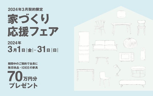 本仕様の受注開始と併せて、2024年3月1日(金)から3月31日(日)までの期間中、無印良品の家をご契約いただいた方を対象に無印良品・IDEEの家具70万円分をプレゼントする「家づくり応援フェア」を開催いたします。