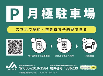 同サービスによって、JAしみずが管理する月極駐車場は、複数の検索サイトやQR付募集看板からいつでも空き確認ができ、そのままオンライン上で申込・契約手続きが最短30分で可能になるほか、満車時の空き待ち予約に対応し、利用者の利便性が向上します。