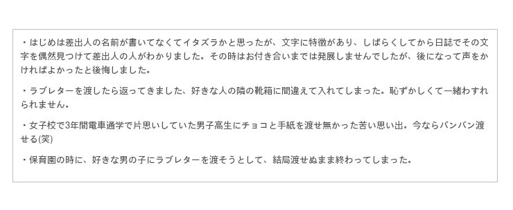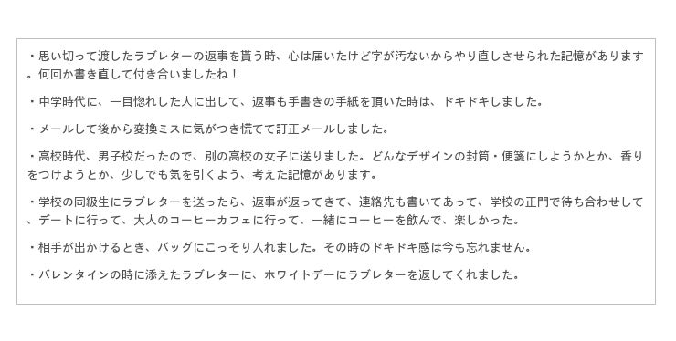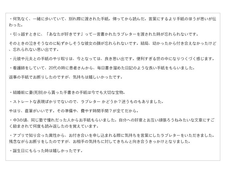 ラブレターといえば、色々な思い出があるようです。今回はそんな中から一部をご紹介させていただきます。
