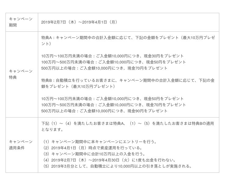 今回のキャンペーン(19年2月7日~19年4月1日)では、キャンペーン期間中にエントリーを行い、「WealthNavi for 住信SBIネット銀行」の口座に10万円以上を入金するなど、条件を満たしたお客さまを対象に、入金額に応じて最大10万円をプレゼントいたします。