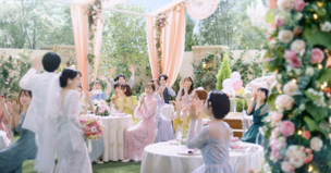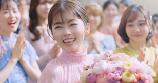 今回のCMの舞台は、美しい花々に囲まれた春のガーデンウエディング。招待された小芝さんは、お庭の片隅でひっそりと「マシュマロフィニッシュパウダー ~Abloom~」の新色「サクラチュール」を頬へのせ、ほわっと血色感UP。花嫁さんにも負けず劣らずの多幸感あふれる透明肌に仕上げて、いざ、結婚式本番へ!ガーデンウエディングの式場では笑顔がこぼれ、ハッピーな時間が流れます。食事、写真撮影、フラワーシャワー。そして、ウエディングのラストを飾るブーケトスでは、みごとピンク色のブーケをキャッチする小芝さん。どの瞬間を切り取っても、小芝さんのふんわりシアワセ透明肌は輝き、ずーーーーっと続いています・・・(ハート)