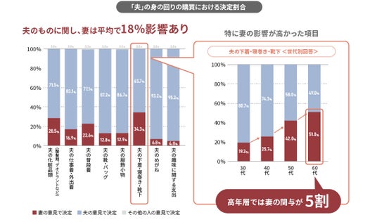 - 夫の下着・寝巻き・靴下: 30代では夫主導が中心ですが、60代になると妻の意見で決定する割合が51.0%と半数を超えています。