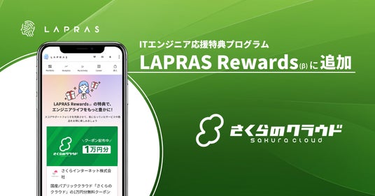LAPRAS株式会社(所在地:東京都渋谷区、代表取締役:染谷健太郎、以下「LAPRAS」)は、ITエンジニアのアウトプットを支援する特典プログラム「LAPRAS Rewards」に、新たな特典として、さくらインターネット株式会社(本社:大阪府大阪市、代表取締役社長:田中 邦裕)が運営するパブリッククラウド「さくらのクラウド」を追加しました。