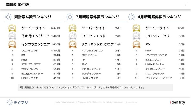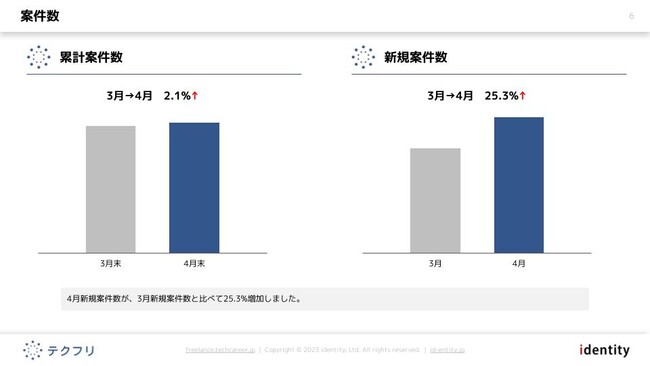 ITフリーランスエンジニアの案件・求人サイト「テクフリ」(https://freelance.techcareer.jp/)を運営する株式会社アイデンティティー(東京都新宿区、代表取締役:今野 力、以下「当社」)は、テクフリのデータベースをもとに2023年4月における案件の市況感を調査しました。より詳しい結果については、お問い合わせから資料請求が可能です。