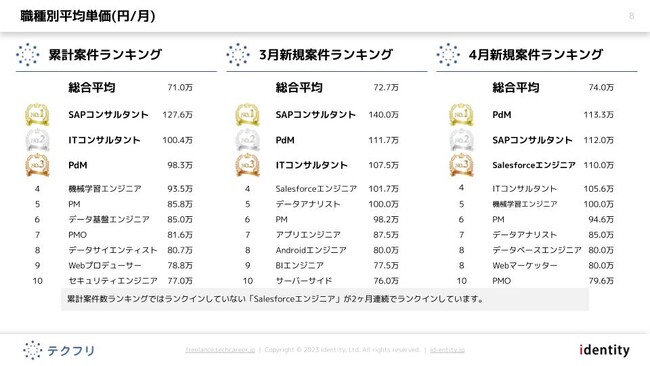 ・職種別平均単価において、累計案件数ランキングではランクインしていない「Salesforceエンジニア」が2ヶ月連続でランクインしています。