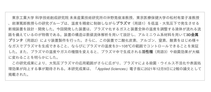 分子や原子は、おかれた温度や圧力に応じて固体・液体・気体の三態をとるが、それに加えて極高温や放電下におかれたとき、第4の状態と呼ばれる「プラズマ」となる。電離気体とも呼ばれるプラズマは、原子や分子の電子がはじき出された状態にあり、プラズマ化した気体そのものや、周囲に存在する気体が活性種となっていることがひとつの特徴である。活性種は反応性が非常に高いため、細菌や有害物質の分解、表面処理や半導体製造などの分野で広く使用されてきたが、近年殺菌、ウイルス不活化や手術における止血といった医療利用などにも期待が寄せられている。その際、プラズマを照射する際の熱による損傷が懸念されるが、既存の低温プラズマは温度が40~100℃程度に至り生体への影響が懸念されるため、より低温環境でプラズマを発生させることが求められている。