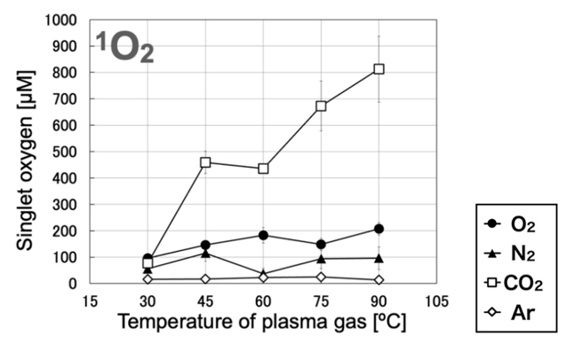 開発した低温プラズマ発生装置を用いて、酸素、二酸化炭素、窒素、アルゴンガスのプラズマを生成し、殺菌効果の評価を行った。プラズマ中で発生する化学活性種として一重項酸素の発生量を評価したところ、二酸化炭素プラズマ中で最も一重項酸素が得られることがわかった。また、プラズマ温度によっても生成する一重項酸素量が変化することが明らかとなった(図4)。