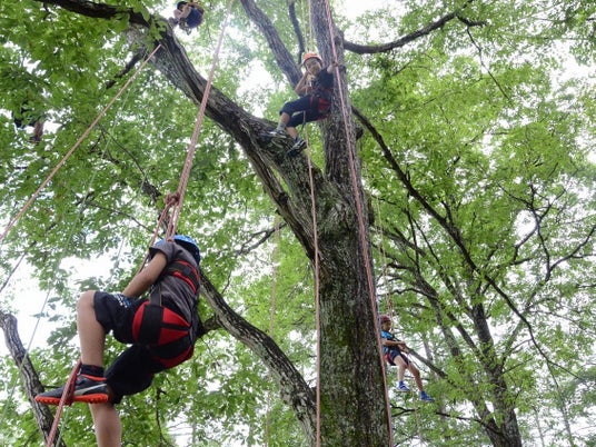 ロープを使った木登り「ツリーイング」。6歳以上のお子さまから体験できる人気のアクティビティです。