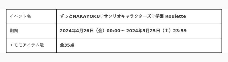 スマホゲーム配信者数で日本一(※)のゲーム配信プラットフォーム「Mirrativ(ミラティブ)」(以下:Mirrativ)を運営する株式会社ミラティブ(本社:東京都目黒区 代表取締役:赤川隼一 以下:ミラティブ)は、2024年4月26日(金)よりMirrativのアプリ内で、株式会社サンリオ(本社:東京都品川区)のキャラクターとコラボしたエモモイベント「ずっとNAKAYOKU(ハート)サンリオキャラクターズ(ハート)学園 Roulette」を開催することをお知らせいたします。