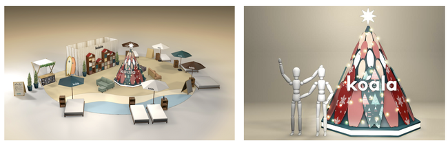 本イベント会場は、オーストラリア生まれのライフスタイルブランドならではの、砂浜やビーチハウスをモチーフにした「サマークリスマス」をテーマに展開します。会場内には、再利用のサーフボードとセンサー感知による点灯を実現した地球に優しいクリスマスツリーが登場します。再利用のサーフボードは、サーファーたちが愛用してきたサーフボードを使用し、オーストラリア人が愛するビーチカルチャーと環境配慮を表現しました。さらに、会場内に配置したマットレスに感知センサーを搭載し、訪れた方がコアラマットレスでのんびりすることによってクリスマスツリーの光が点灯する仕組みとなっております。コアラマットレスに感知センサーを施した仕組みを導入した背景に、昨今における電力高騰問題があります。コアラでは、健康な地球を創るために資金援助することを誓約し、その活動を支援、促進することをミッションとする「1% FOR THE PLANET」に賛同しており、環境保護活動を行っています。そのため、今回登場するサーフボードのクリスマスツリーは常時点灯するのではなく、人々がのんびりと過ごす時のみ全体が点灯する地球に優しいクリスマスツリーを実現しました。
