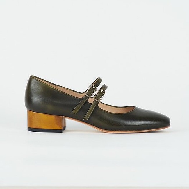 絶妙なニュアンスが可愛いオリーブグリーンに、マスタードカラーのヒールがおしゃれな一足です。今年も人気の「メアリージェーンシューズ」で、細めのダブルストラップが華奢な印象に見せてくれます。