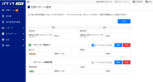 1. バクラク請求書の設定メニューから仕訳パターンのメニューを開き、仕訳パターンを作成してください