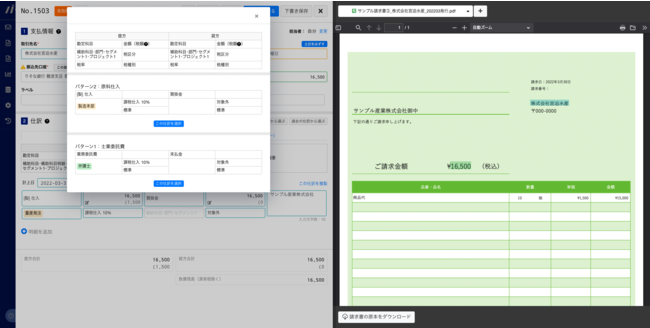 3. 選択した仕訳パターンが適用され、仕訳が自動で入力されます