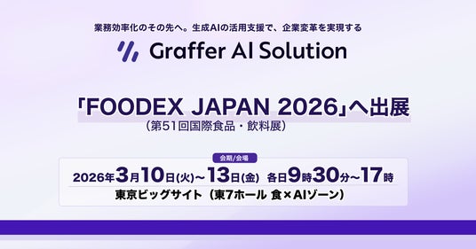 生成AI活用による企業変革を実現する株式会社グラファー(本社:東京都渋谷区、代表取締役:石井大地、以下「当社」)は、2026年3月10日(火)~13日(金)に東京ビッグサイトで開催される「FOODEX JAPAN 2026」に出展します。当社ブースでは、食品業界において推計年間1,000億円規模のコスト要因となっている食品規格書のデータ連携課題を解決する「Graffer Databridge(*1)」の展示を行います。