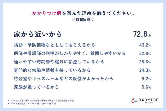 自身または子どもにかかりつけ医がいる保護者に対し、そのかかりつけ医を選んだ理由を尋ねたところ「家から近いから」が72.8%と最多であり、次いで「検診・予防接種などもしてもらえるから」が43.2%で2番目に多い結果になりました。その他にも「予約なしでも診てもらえる」「出産した時から診てもらっているから」など、いつでも安心して通える点を上げる保護者の声が多く寄せられました。