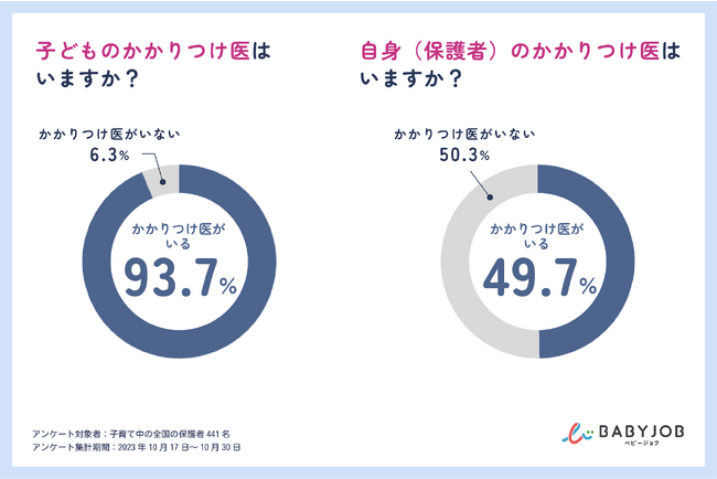 BABY JOBが子育て中の全国の保護者441名を対象に医療についてアンケート調査を行った結果、「お子さまのかかりつけ医はいますか?」という質問に対して「かかりつけ医がいる」と答えた保護者は93.7%に上りました。一方で、「ご自身のかかりつけ医はいますか?」という質問に対して「かかりつけ医がいる」と答えた保護者は、わずか49.7%にとどまりました。