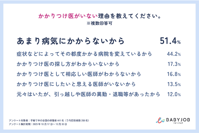 また、自身または子どもにかかりつけ医がいない保護者に対し、その理由を尋ねたところ「あまり病気にかからないから」が51.4%と最多であり、次いで「症状などによってその都度かかる病院を変えているから」が44.2%で2番目に多い結果になりました。その他にも「風邪をひいたら行く病院はあるがかかりつけとして認識はしていない」「かかりつけ医を作る意味をきちんと理解していない」など、”かかりつけ医”としての必要性や医師との関係性が築けていないような声も多く寄せられました。