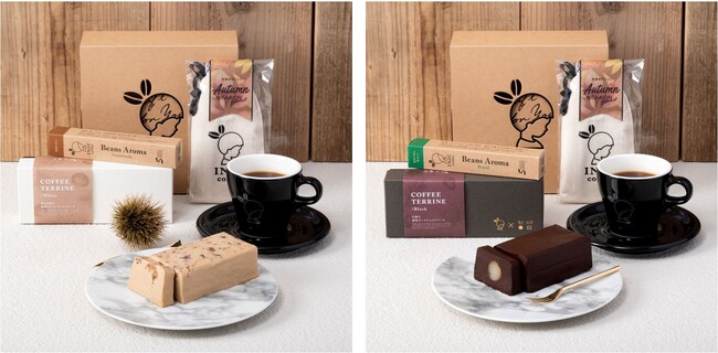 栗のほっくりとした甘さが特徴の「栗と白餡の珈琲ホワイトチョコテリーヌ」には深いコクの「Beans Aromaグァテマラ」や深みのある「オータムブレンド」をセットに。