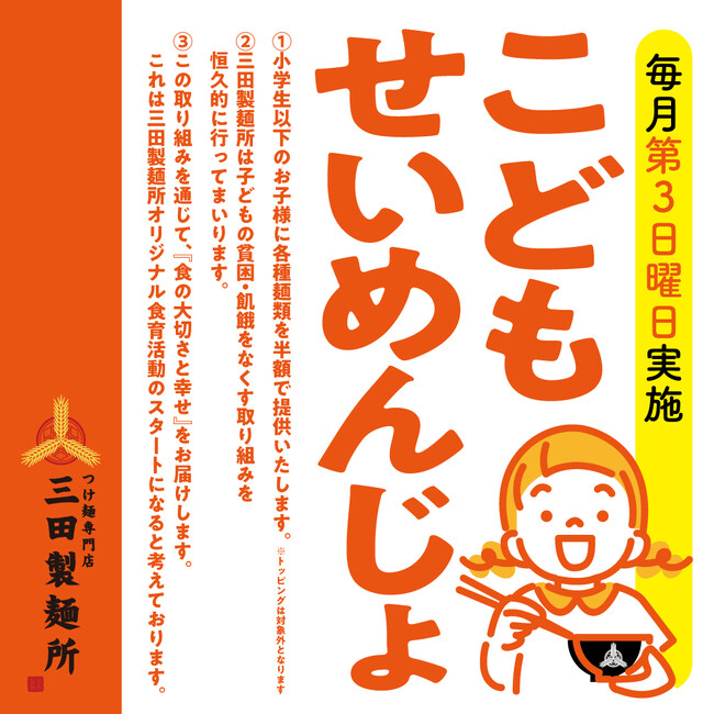 株式会社エムピーキッチン(本社:東京都渋谷区、代表取締役:村上竹彦)が運営する『つけ麺専門店 三田製麺所』は、より多くの世代の方々につけ麺の美味しさを伝えていく活動に力を入れており、その一環として独自の食育活動『#子どもせいめんじょ』の取り組みを立ち上げました。毎月第三日曜日は小学生以下のお子様に各種麺類を半額で提供しております。2024年1月21日(日)の #子どもせいめんじょ の実施レポートをお伝えします。