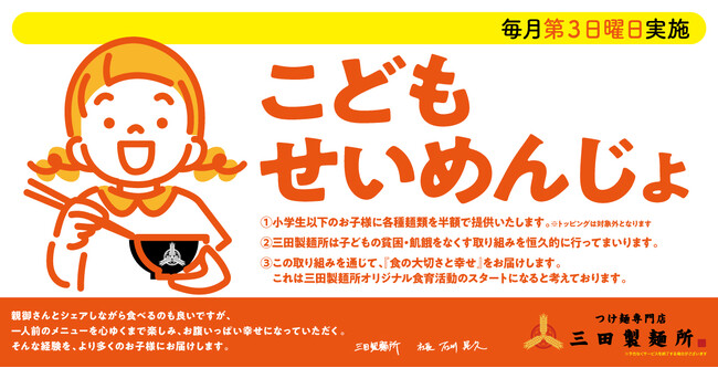 この取り組みを通じて、『食の大切さと幸せ』をお届けします。これは、三田製麺所オリジナルの食育活動のスタートになると考えております。親御さんとシェアしながら食べるのも良いですが、一人前のメニューを心ゆくまで楽しみ、お腹いっぱい幸せになっていただく。そんな経験を、より多くのお子様にお届けします。