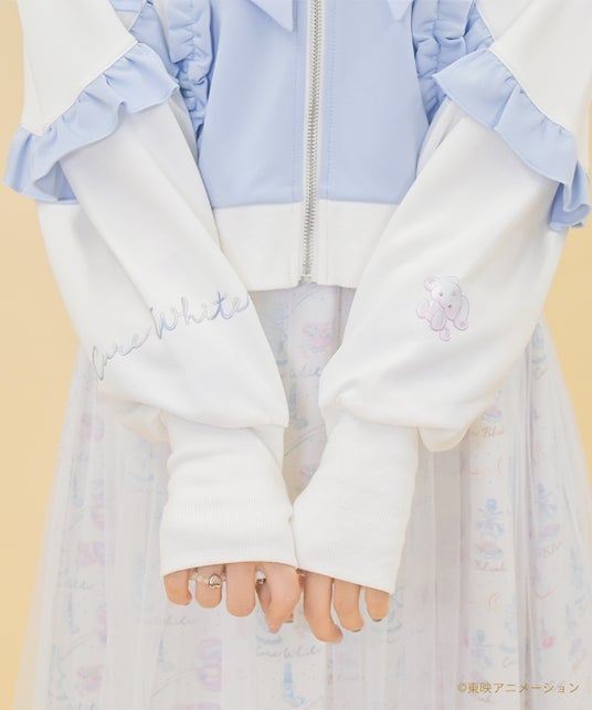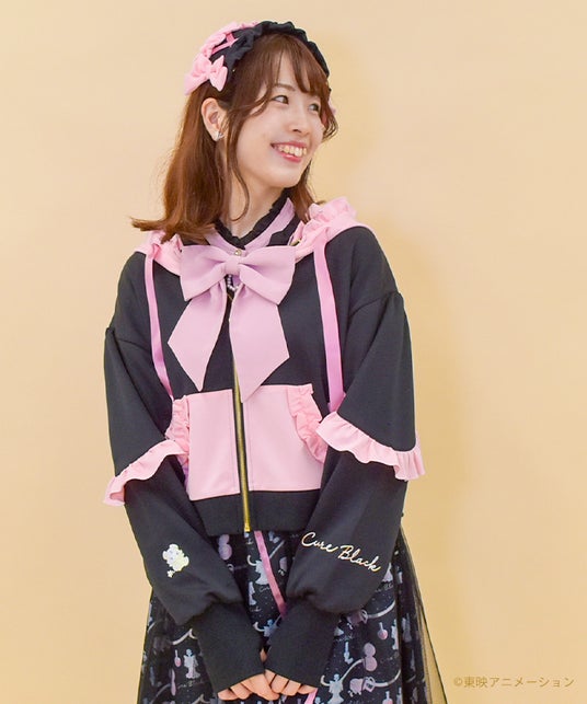 黒×ピンクの配色でキュアブラックを、白×水色の配色でキュアホワイトをイメージしたパーカー。袖口にはかわいらしい妖精とロゴのモチーフをプリントであしらい、フィンガーホールの空いたデザインが心躍る1着。