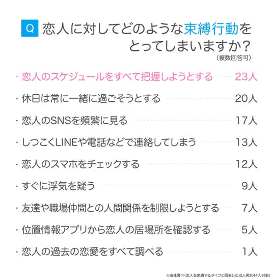 恋人を束縛するタイプの成人男女44人に対して、恋人に対してどのような束縛行動をとっているか尋ねてみました。