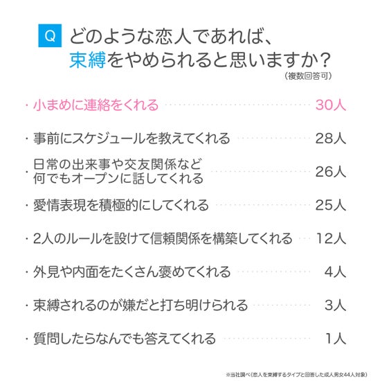 恋人を束縛するタイプの成人男女44人に対して、どのような恋人であれば束縛をやめられると思うか尋ねてみました。