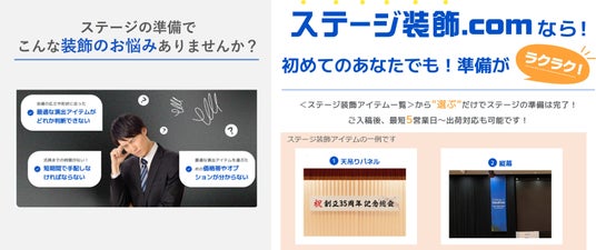 「ステージ装飾.com」は、セミナー会場や記念式典などの装飾に必要なアイテム一覧から選ぶだけで、ステージの準備が完了出来るサービスとなります。