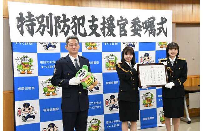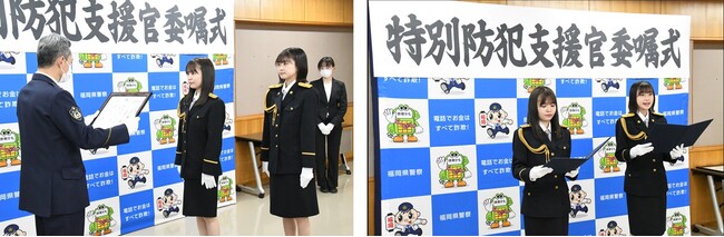 再委嘱式の中で、HKT48の両支援官は特別防犯支援官としての決意表明を行い、「本日、私たちHKT48は、特別防犯支援官の委嘱状の交付を再び受けました。福岡県内のニセ電話詐欺の被害は、現在、大変厳しい状況です。私たち、支援官は、今後も引き続き若い方からご高齢の方まで幅広い世代に注意を呼び掛け、「家族の絆」、「地域の絆」で福岡県からニセ電話詐欺を撲滅したいと思います。」と、力強く述べました。
