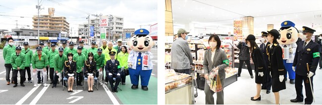 その後、HKT48の両支援官は、早良区のイオン原店で行われた年末年始特別警戒活動出動式に参加し、早良警察署の警察官や防犯ボランティアに向けて、警戒活動に向けてのメッセージを送るとともに、イオン原店内において詐欺被害防止を呼び掛けました。