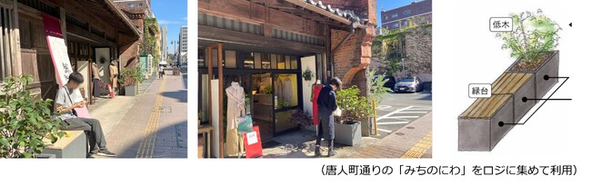 唐人町通りで同時期に実施している「みどりの社会実験」において沿道民地と協力し設置しているみどりとベンチ(通称みちのにわ)を会場に移動し、憩い空間を演出します。