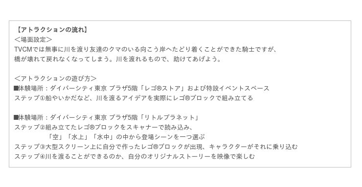 新TVCMのキャラクターである騎士とクマがスクリーンに登場、レゴ(R)ブロックを組み立てることによりTVCMの続きとなる自分だけのオリジナルストーリーを作ることができます。