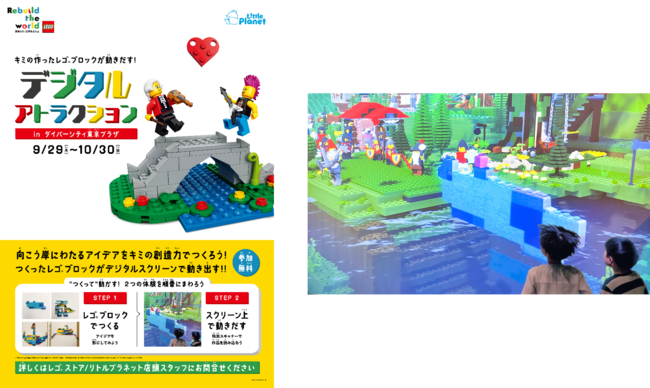 次世代型テーマパーク「リトルプラネット」(https://litpla.com)との初のコラボレーションにより、自分で作ったレゴ(R)ブロックがスクリーン上で動き出すアトラクション「キミの作ったレゴ(R)ブロックが動きだす ! デジタルアトラクション」を実施します。