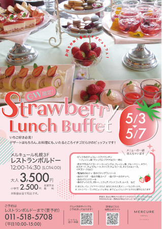 メルキュール札幌(所在地:札幌市中央区南4条西2丁目2-4、ホテル支配人:カーセル クリストファー)は、同ホテル3F レストランボルドーにて、ゴールデンウィーク中(5/3日(水)~5/7日(日))の期間限定で、『Strawberry Lunch Buffet 』(旧名称いちごフェア)を3年間ぶりに開催致します。