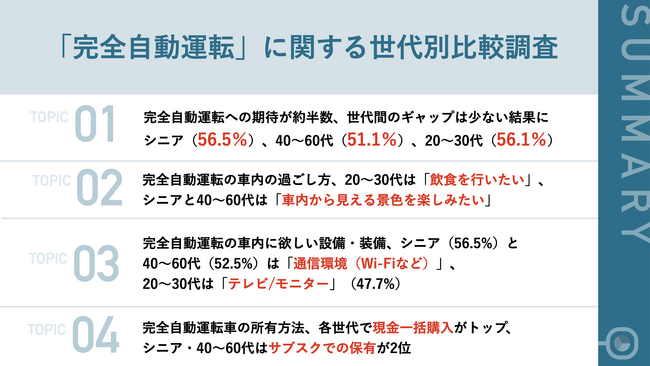株式会社KINTO(本社:愛知県名古屋市、代表取締役社長:小寺 信也)は、運転免許を保有する、20~30代男女221名、40~60代の男女221名、70代以上の男女221名、合計663名を対象に、「完全自動運転」に関する世代別比較調査を実施しましたので、お知らせいたします。