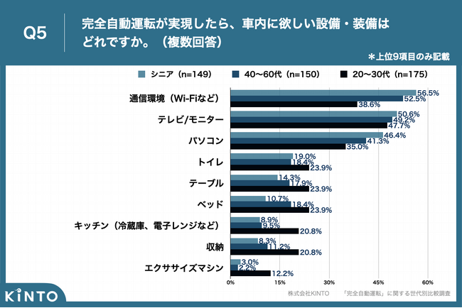 Q5. 完全自動運転が実現したら車内に欲しい設備・装備、シニアと40~60代は「通信環境(Wi-Fiなど)」、20~30代は「テレビ/モニター」
