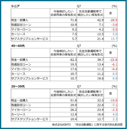 Q7. 完全自動運転の車の保有方法、各世代で「現金一括購入」がトップ、シニア・40~60代は「サブスク」が2位