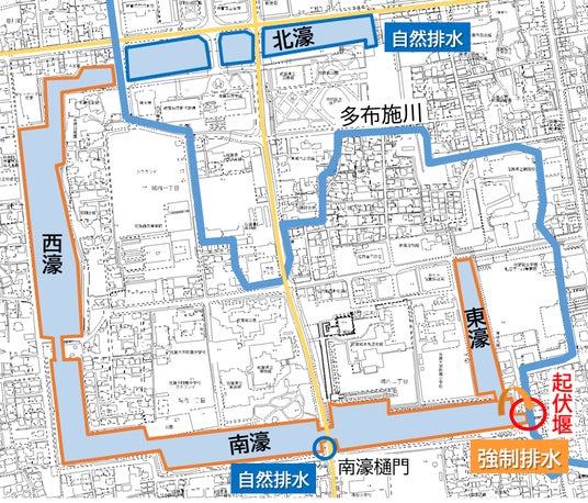 全国初の取り組みである「お濠貯留」は、令和5年の出水期から、お濠の水位を「自然排水」により事前に下げた状態で管理し、さらに北濠も活用することで、最大5万8,000トンの容量を確保しています。