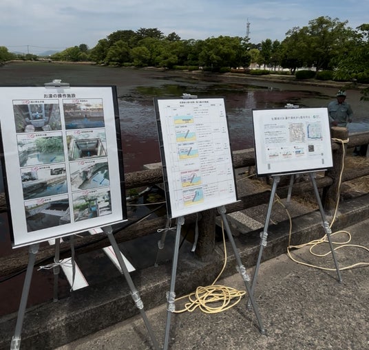 今回の実証試験では、流域治水の観点から、佐賀県所有の排水ポンプ車「ひので」の協力のもと、5万8,000トンという限界を超えて、お濠のさらなる水位低下が可能かを検証するものとなります。