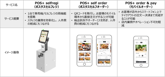 「POS+」は、店舗の売上向上や店舗運営担当者の業務負担軽減による生産性向上を実現し、また従業員にとって 利便性の高い機能を搭載する店舗向けソリューションです。飲食店向け「POS+ food」や小売業向け「POS+ retail」、理美容向け「POS+ beauty」のクラウド型モバイルPOSレジをはじめ、セルフレジ・券売機「POS+ selfregi」、モバイルセルフオーダーサービス「POS+ self order」、テーブルトップオーダーサービス「POS+ TTO」などの様々なソリューションで、効率的な店舗運営を支援いたします。