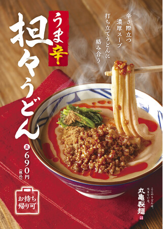 毎年好評の人気商品『うま辛担々うどん』は、濃厚な担々スープに、辛さと肉感が特徴の肉そぼろ、香味ラー油、彩りのほうれん草、かつお粉の相性が抜群な一杯。濃厚担々スープができたてのうどんに絡むこだわりの一杯を今年もご堪能いただけます。