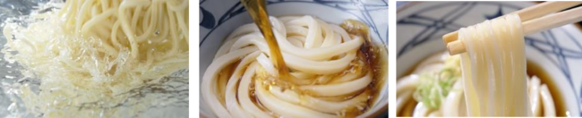 「おいしいうどん」は、徹底的に鮮度にこだわりぬいた「生きている」状態で提供されて初めて実現できる、と丸亀製麺は信じています。丸亀製麺がお届けするうどんは、国内 800 を超えるすべての店で一軒、一軒、手間を惜しまず、毎日、100%国産の小麦粉から打っています。打ち立てのうどんにこだわり、その場で切って、茹でて、作りたてをお客さまに提供しているからこそ、もちもちでおいしい独自の“丸亀食感”をお届けできています。